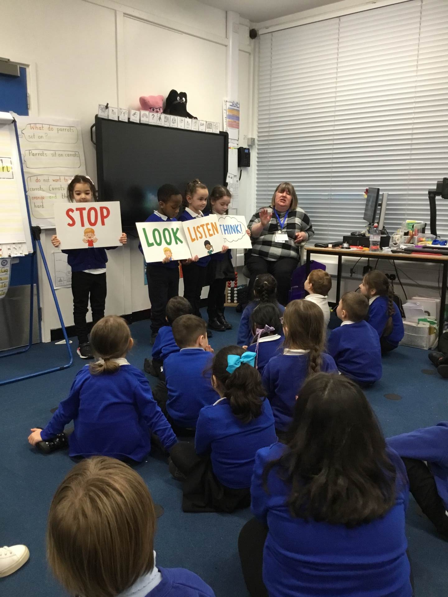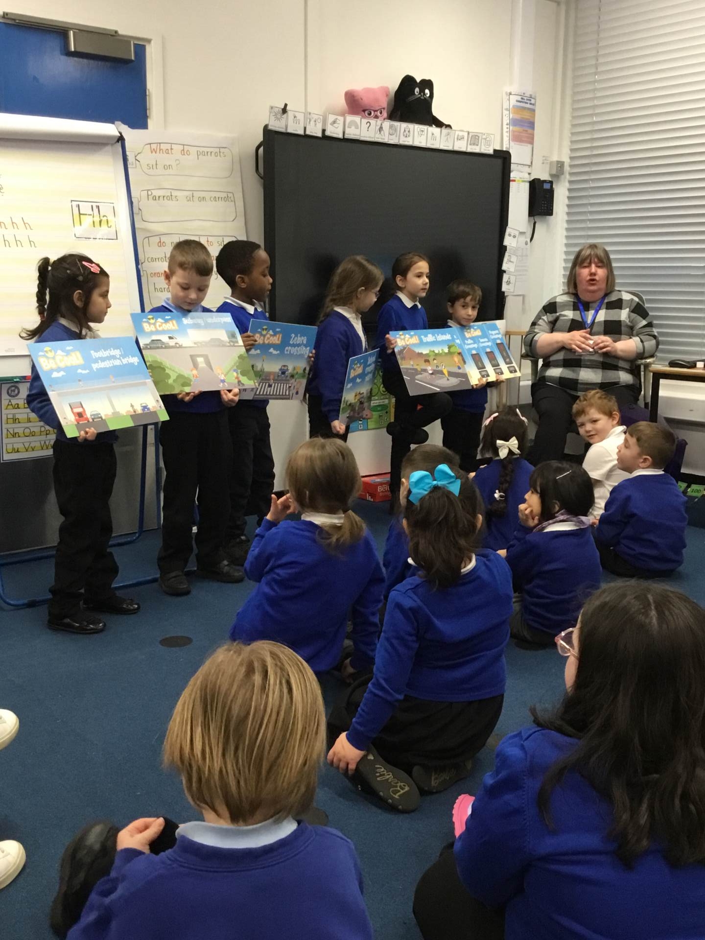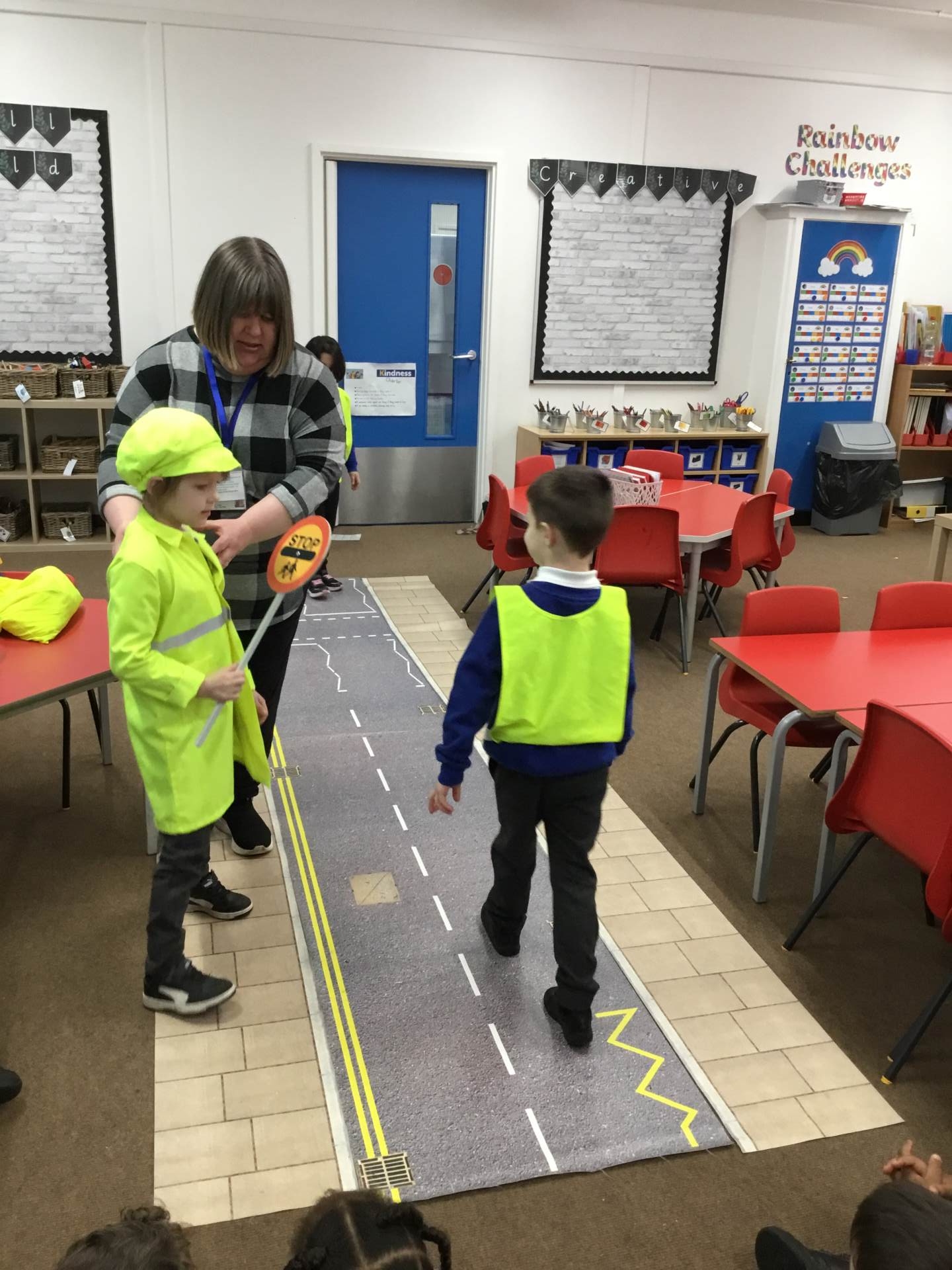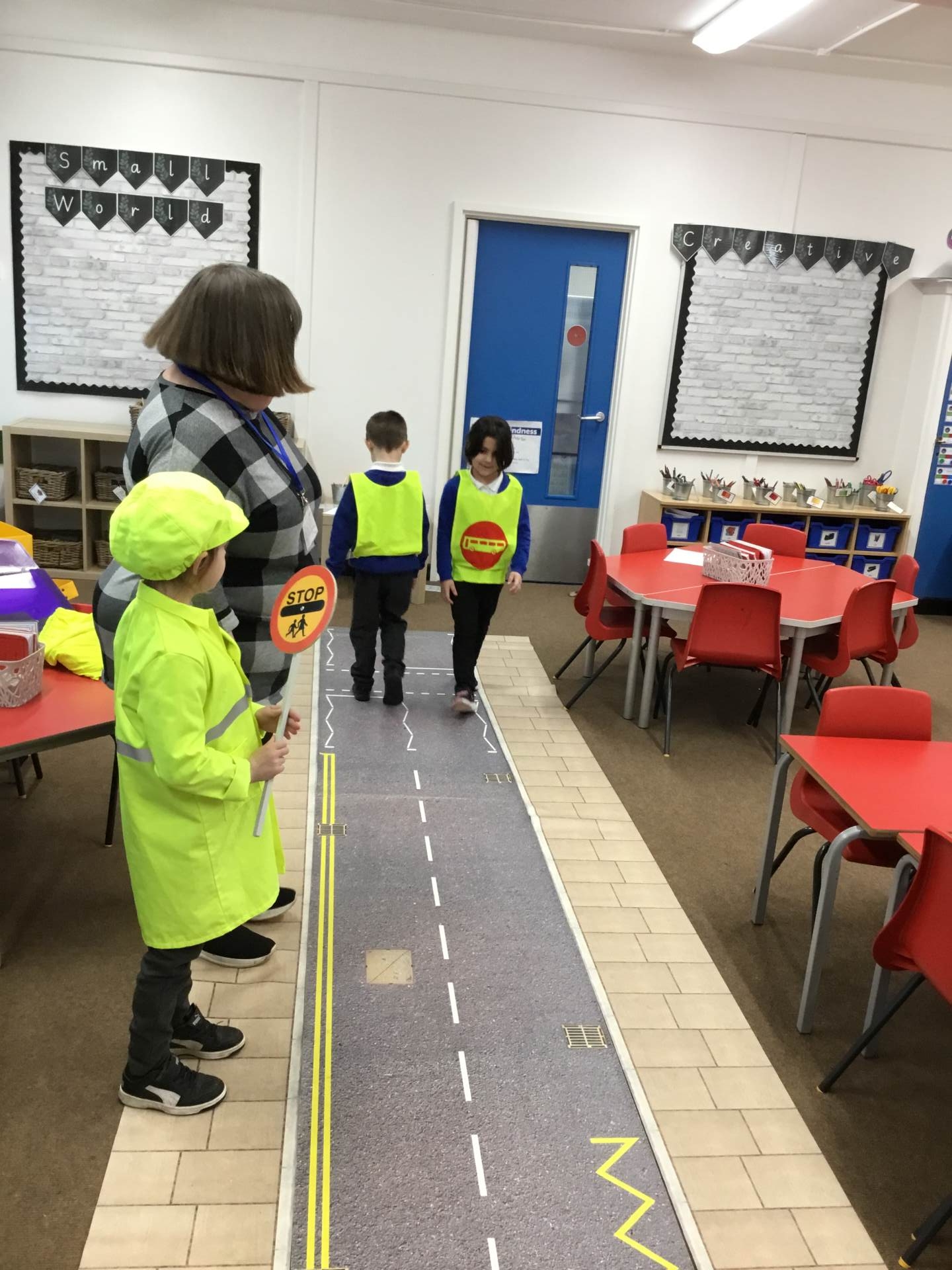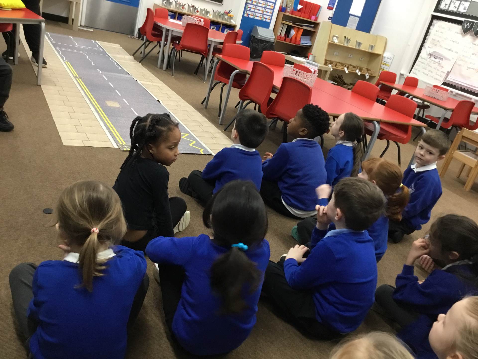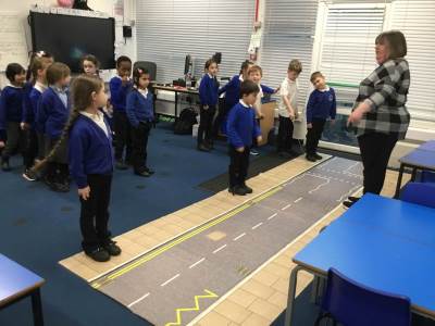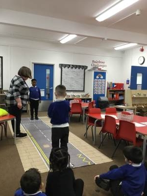 Pink and Blue Class enjoyed a visit from Sara who came to talk to us about road safety. The children practised the processes: STOP, LOOK, LISTEN, THINK and LOOK RIGHT, LEFT and RIGHT again.